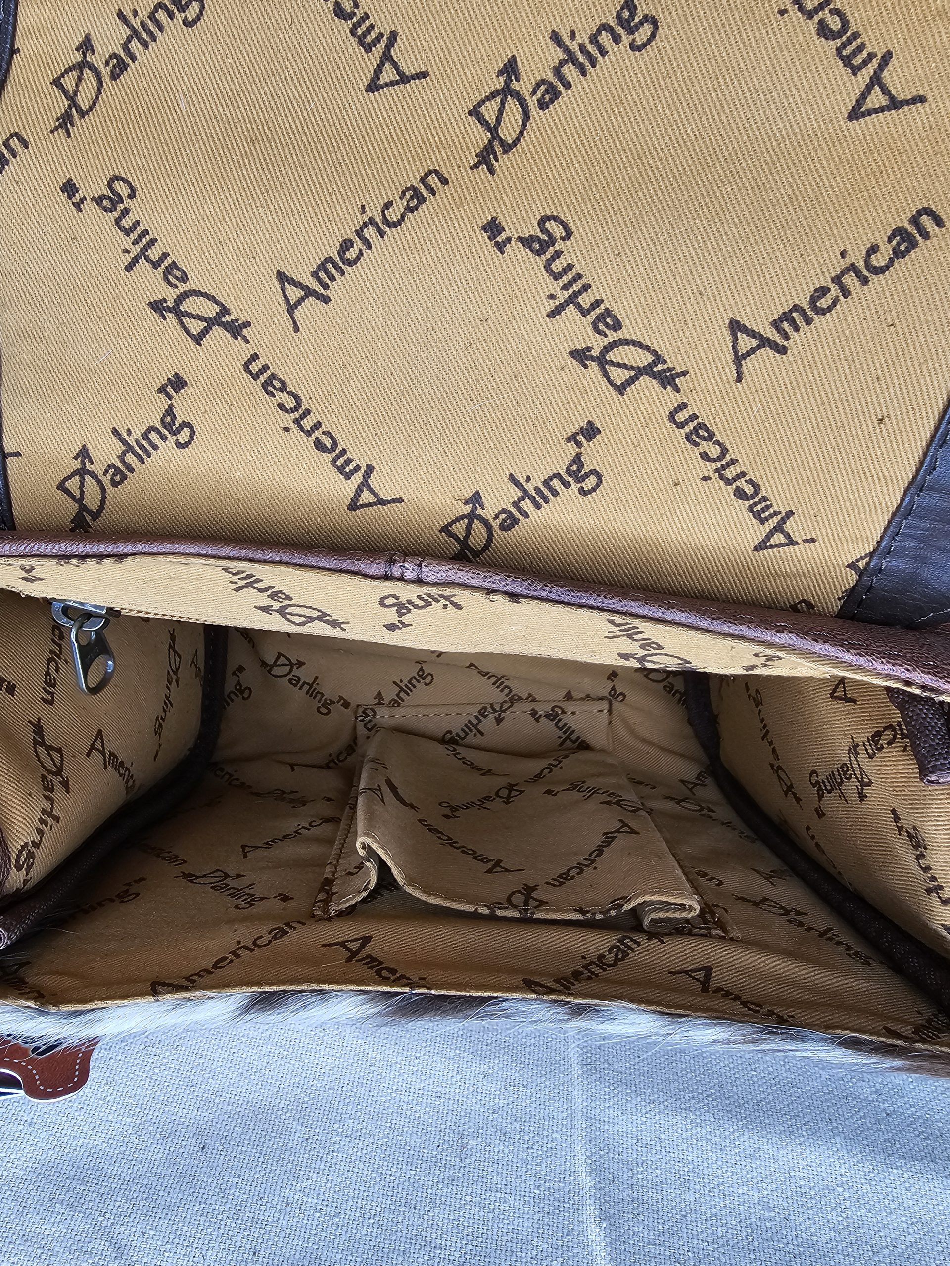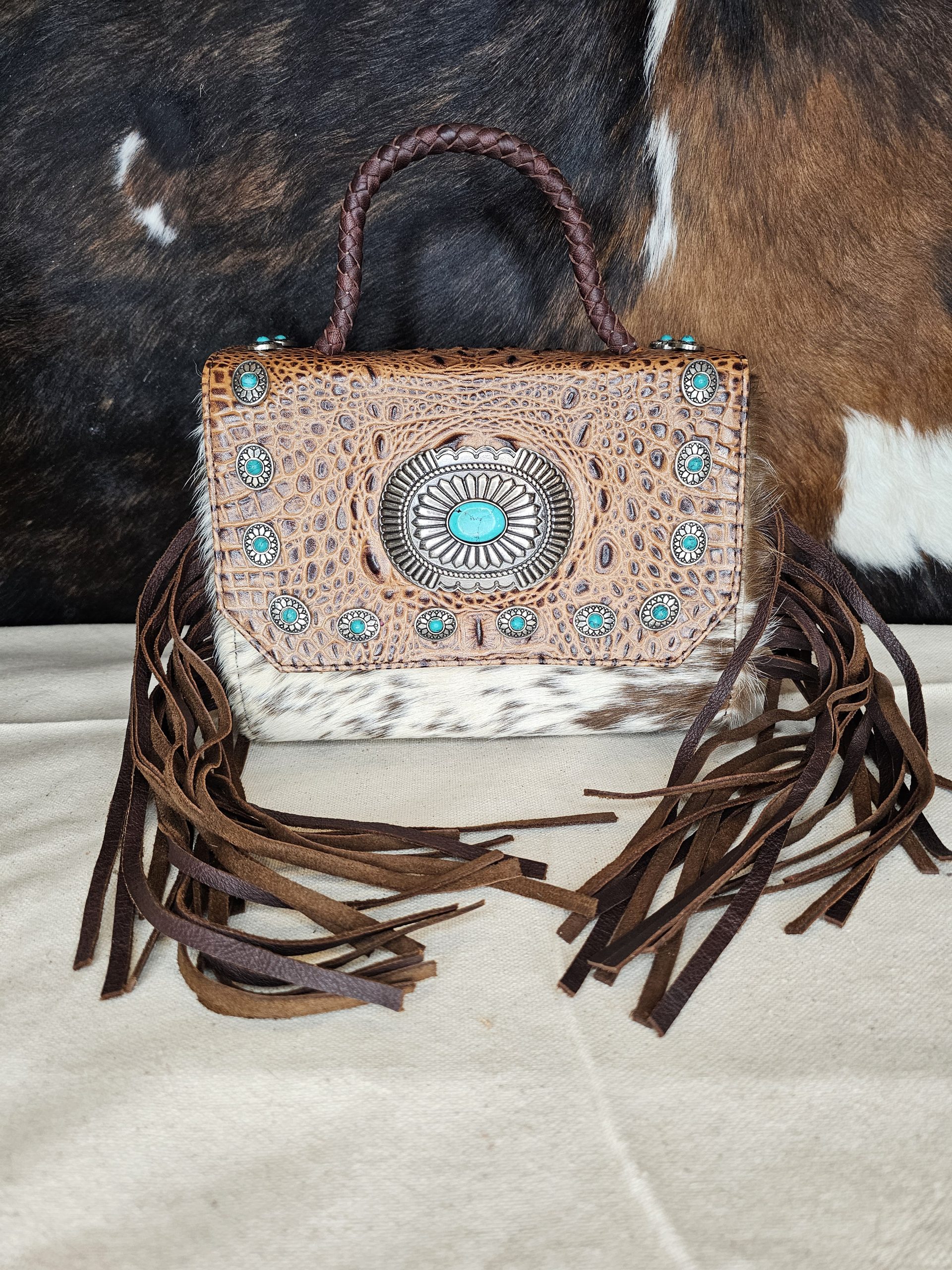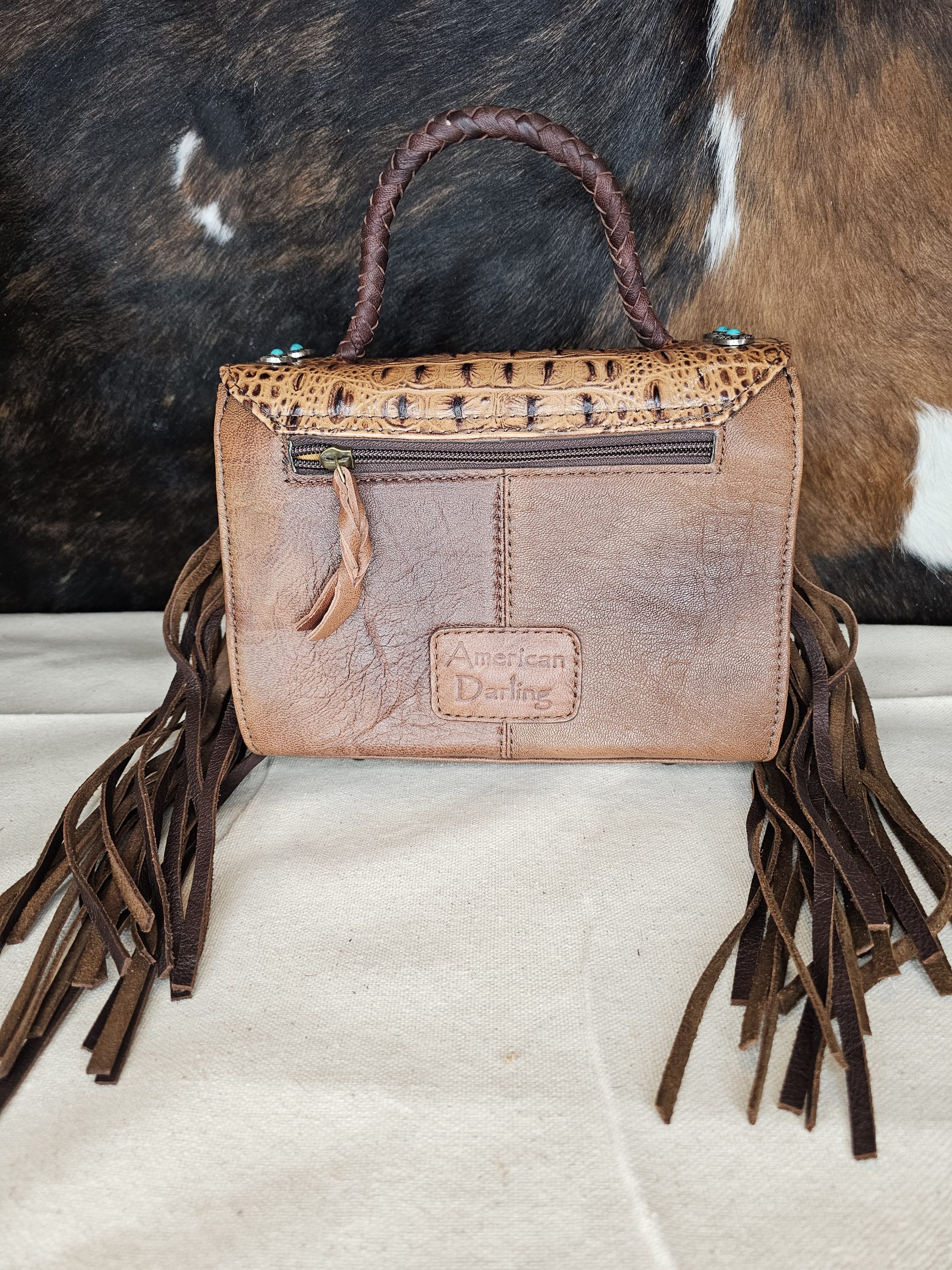 American Darling Croc embossed, hair on hide handbag. Silver colored conchos with turquoise colored stones on top flap closure. Braided leather loop handle. Leather fringe. A zippered pocket on back. Bottom has leather with studs for protection. Adjustable/detachable crossbody strap. Inside: 1 zippere pocket and 1 open pocket. Measures: 9 inches X 4 inches X 7 inches.