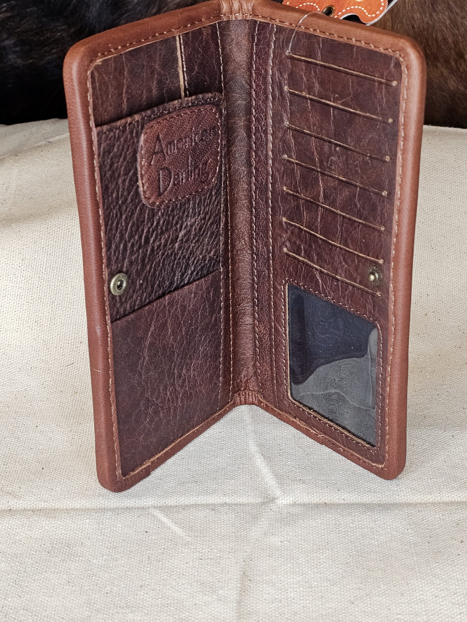 American Darling clutch Saddle Blanket genuine leather. Snap closure. Inside 7 card slots, 1 clear ID slot, 1 cash pocket and 3 larger pockets. Measures: 8 inches X 4 inches.