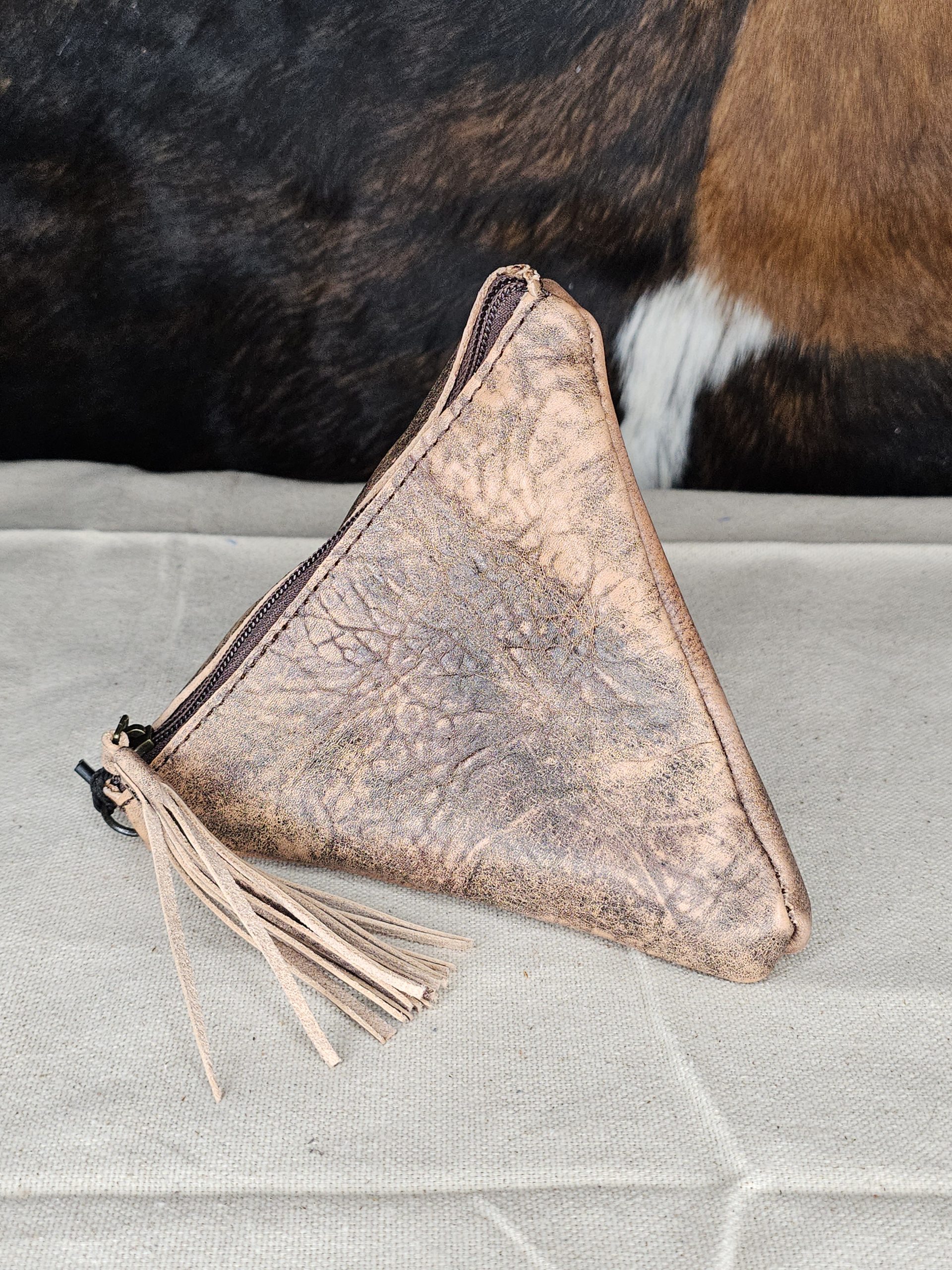 American Darling genuine leather wristlet in triangular shape. Leather tassel zipper pull, detachable wrist strap. Measures: 8 inches X 8 inches X 8 inches.