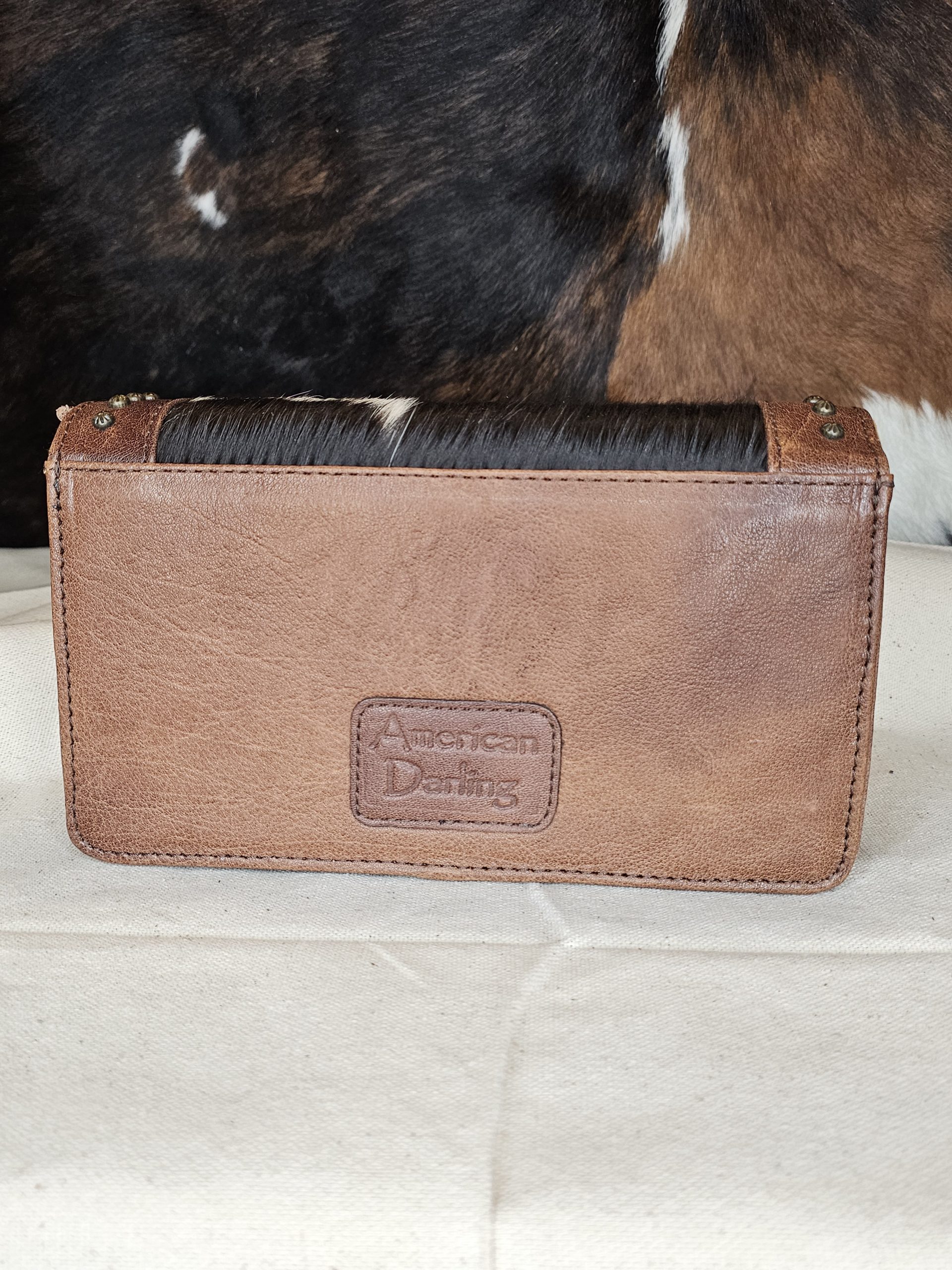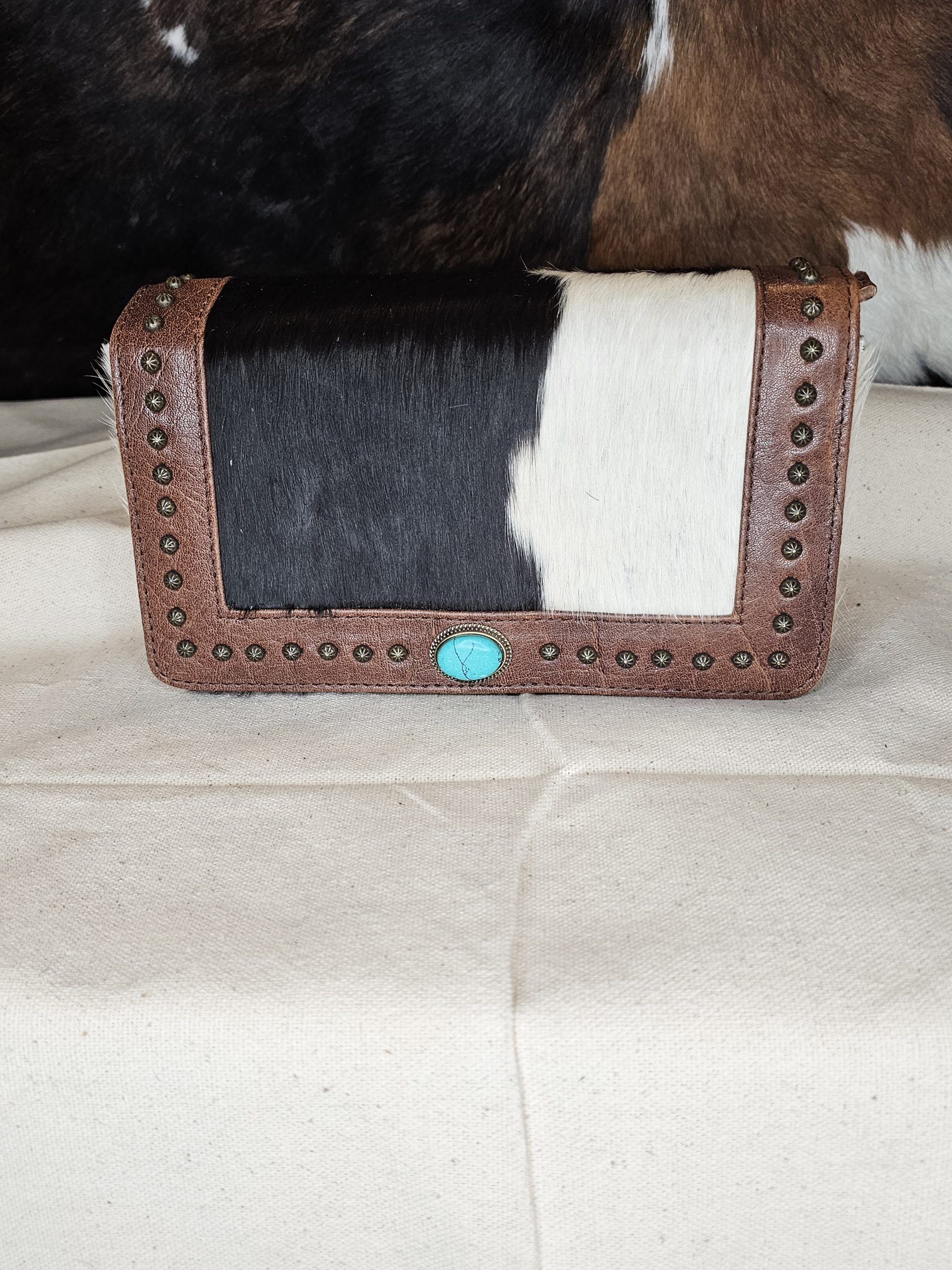 American Darling Crossbody, hair on hide with genuine leather, patina studs with turquoise colored stone. Magnetic snap front flap closure plus top zippered closure. Inside one zippered pocket and one open pocket. Measures: 10 inches X 3.5 inches X 6 inches.