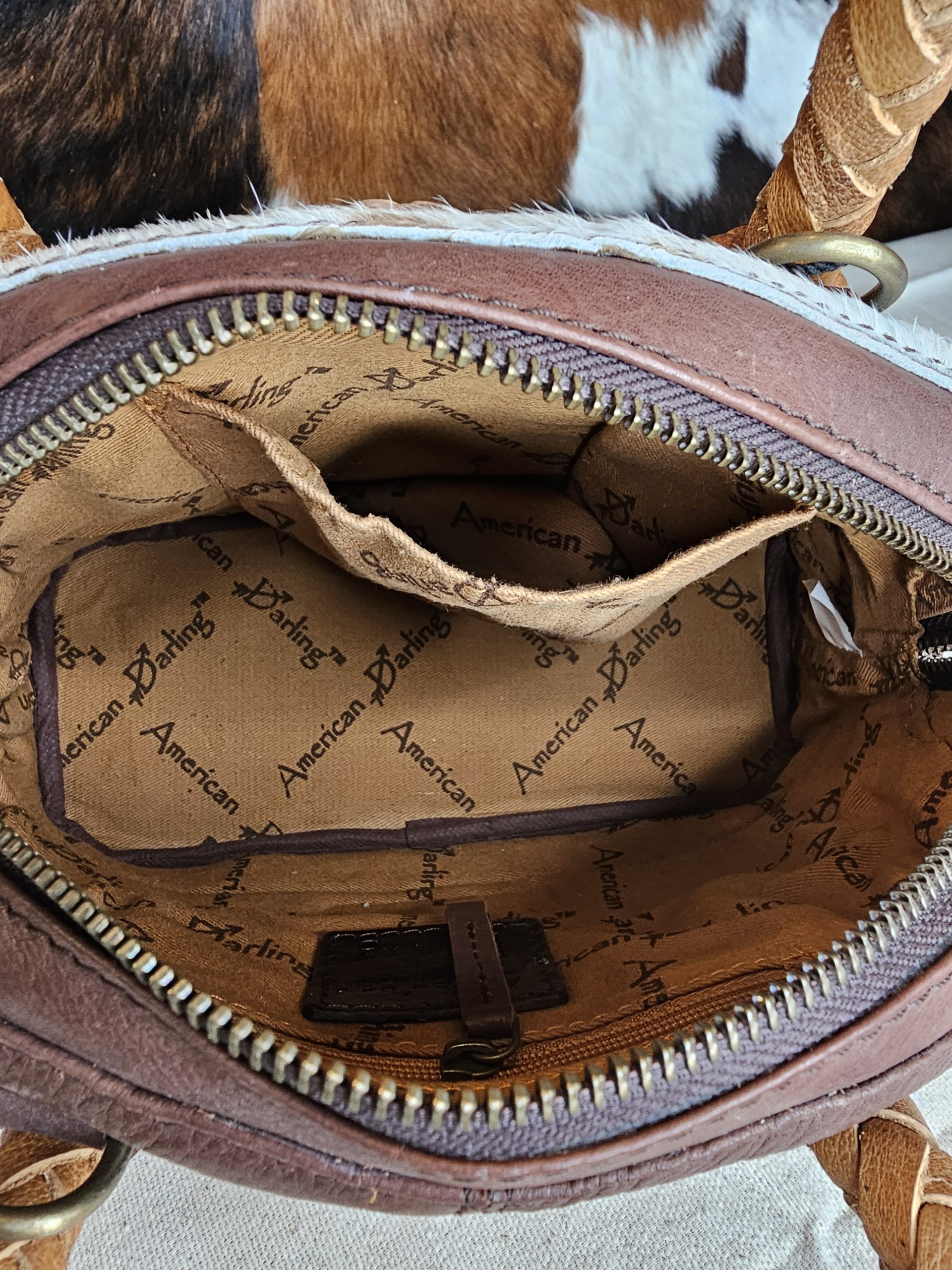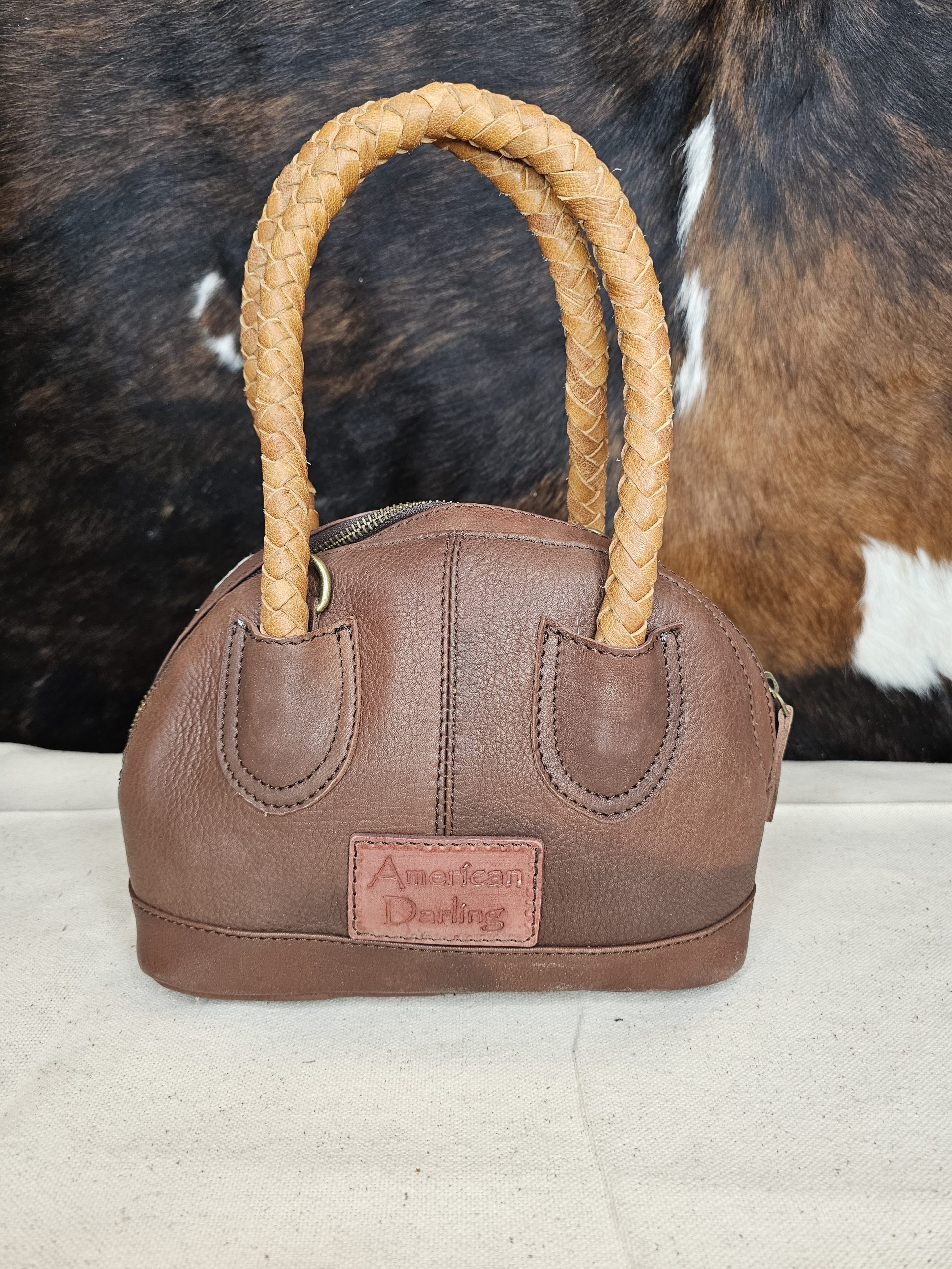American Darling Genuine hair on hide leather purse with leather concho and blue colored stone. Dual loop braided handles with fringe on the front. Braided detachable crossbody strap. Bottom is leather with studs for protection. Inside 1 zippered pocket and one open pocket. Measures: 7 inches X 4 inches X 9 Inches.