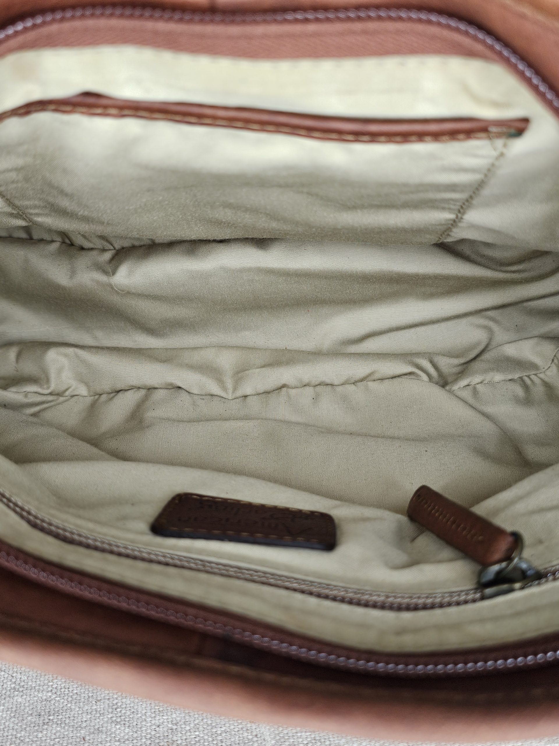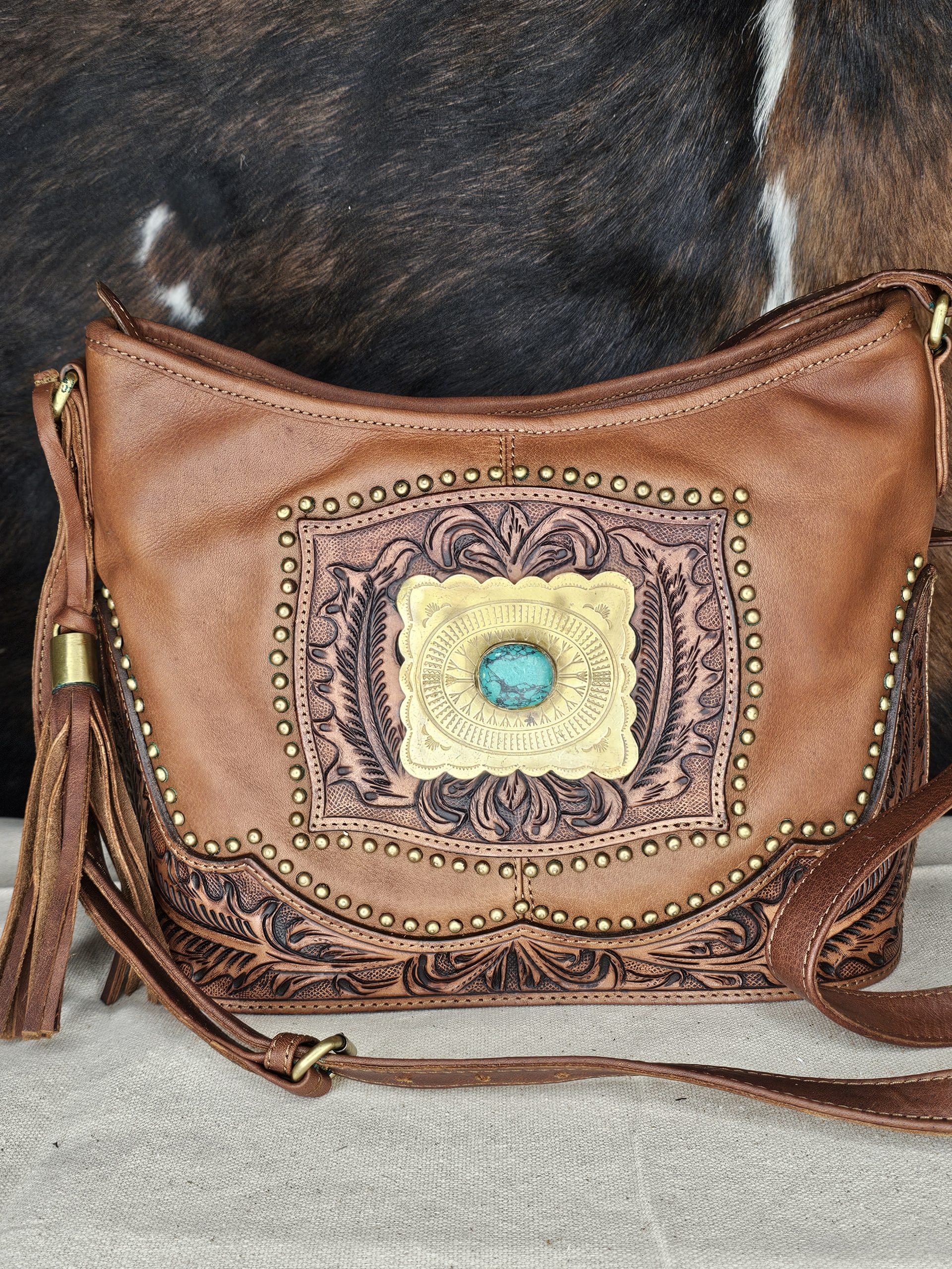 American Darling Messenger Hand Tooled Genuine Leather with metal studs with metal conch and blue colored stone on front. Leather Tassel on strap. Conceal carry pocket on back. Inside: 1 zippered