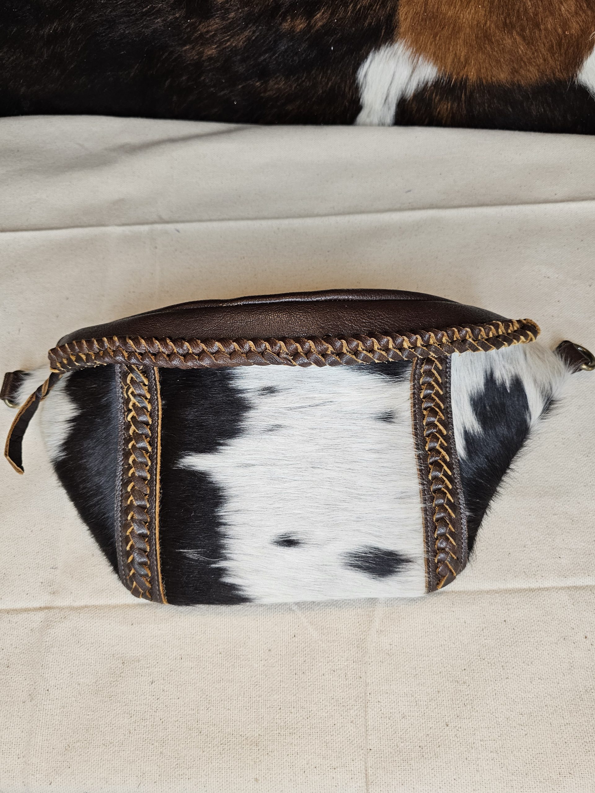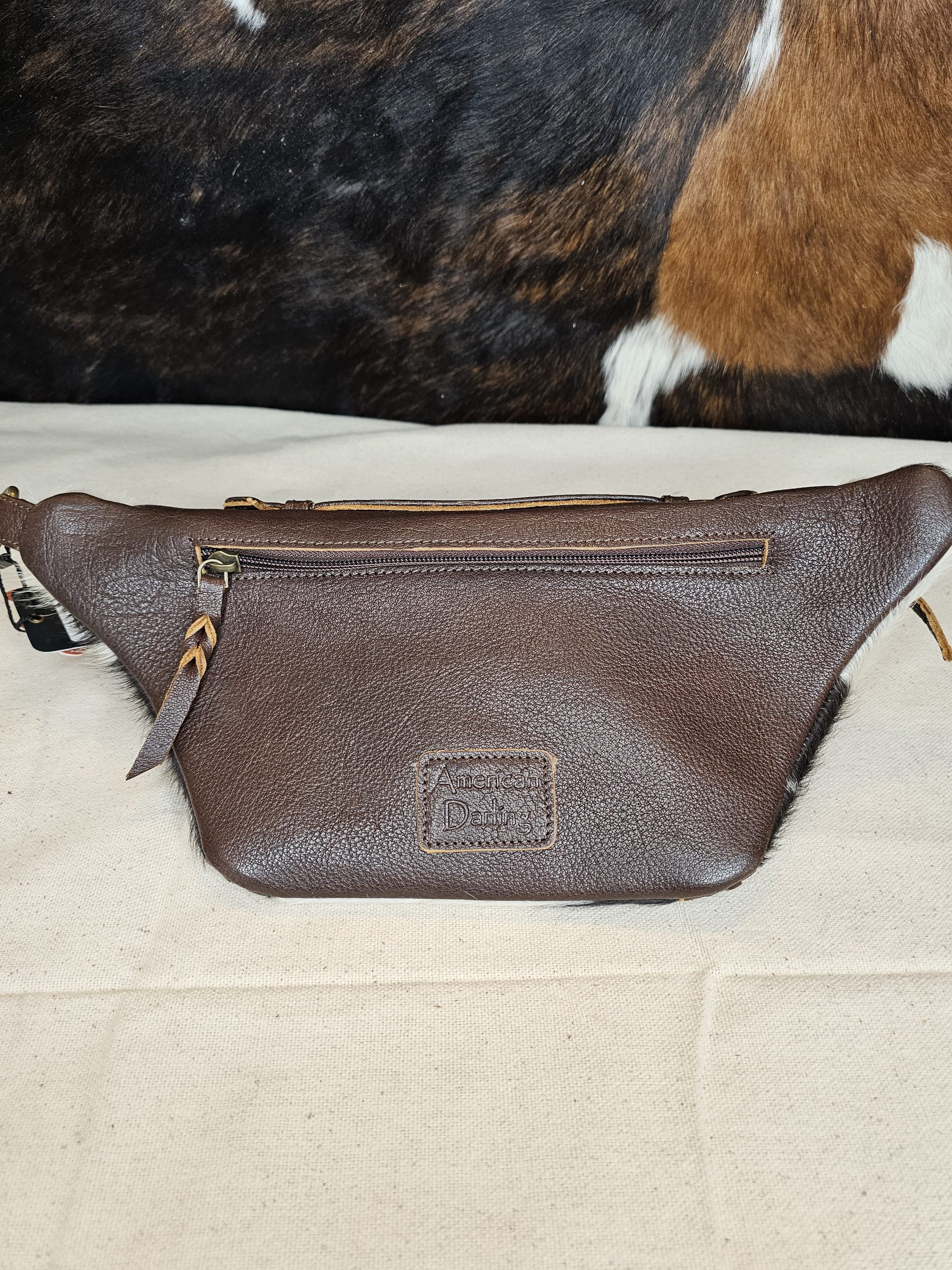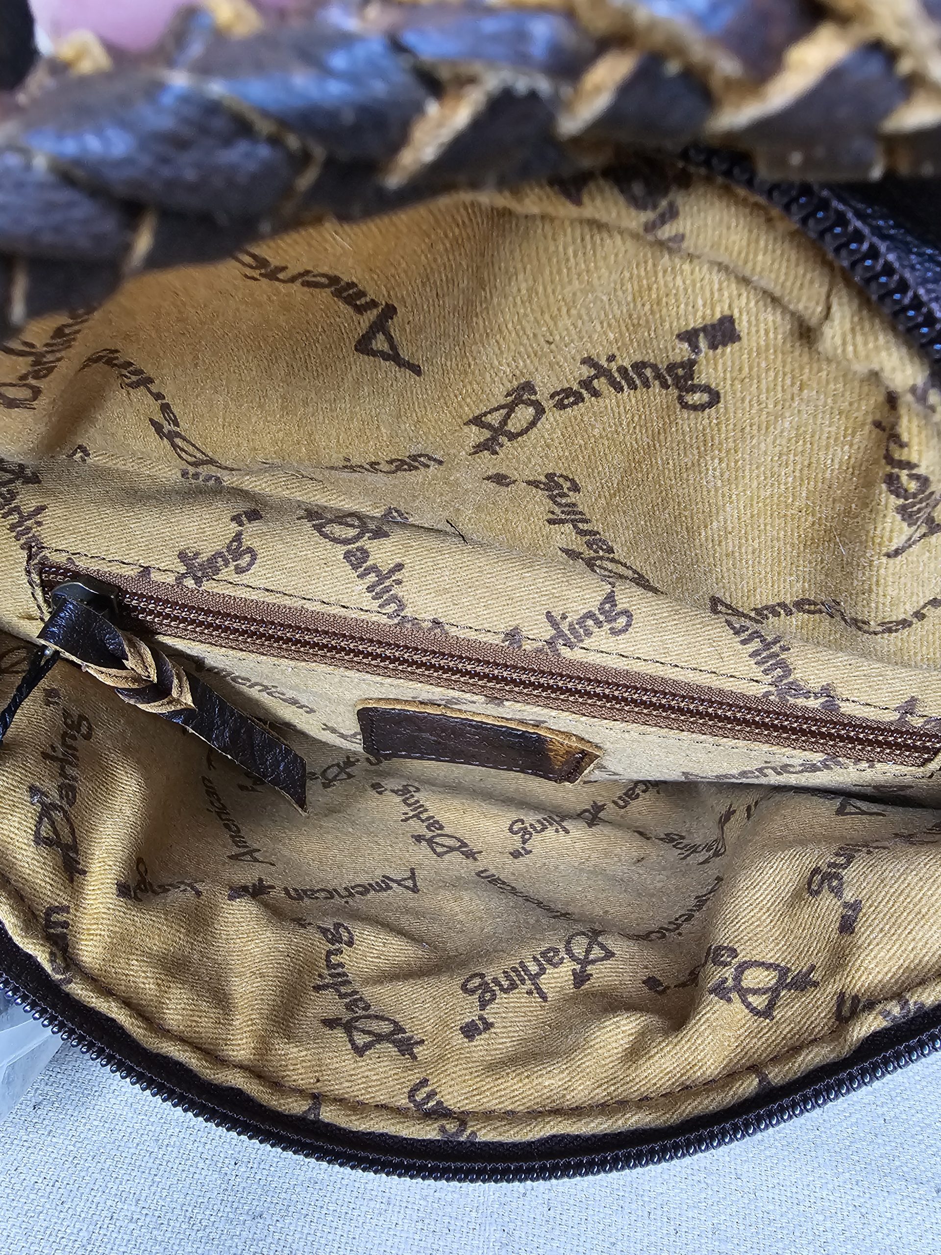 American Darling bag hair on hide genuine leather. Braided leather accents. Zippered pocket on back. Top handle. Adjustable/detachable strap. Covered zipper opening with one zippered inside pocket. Measures: 17 inches (from ring to ring) X 4 inches (at the deepest part) X 7 inches (at the tallest portion).