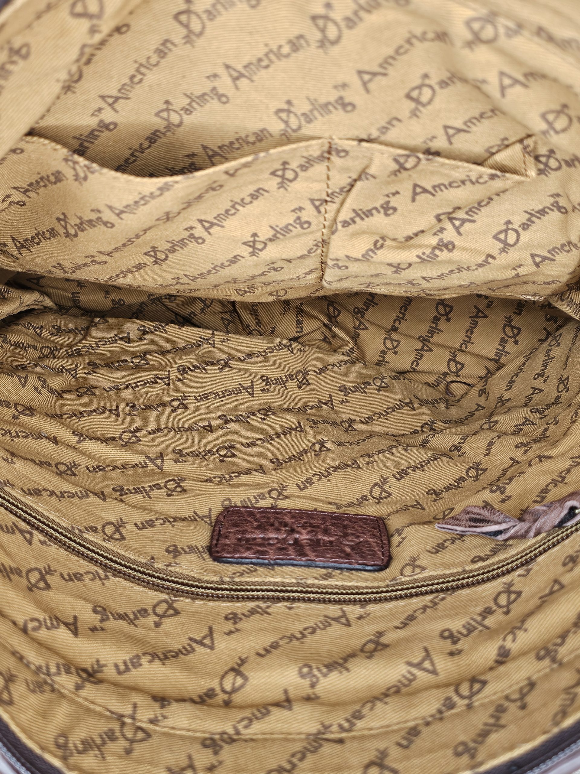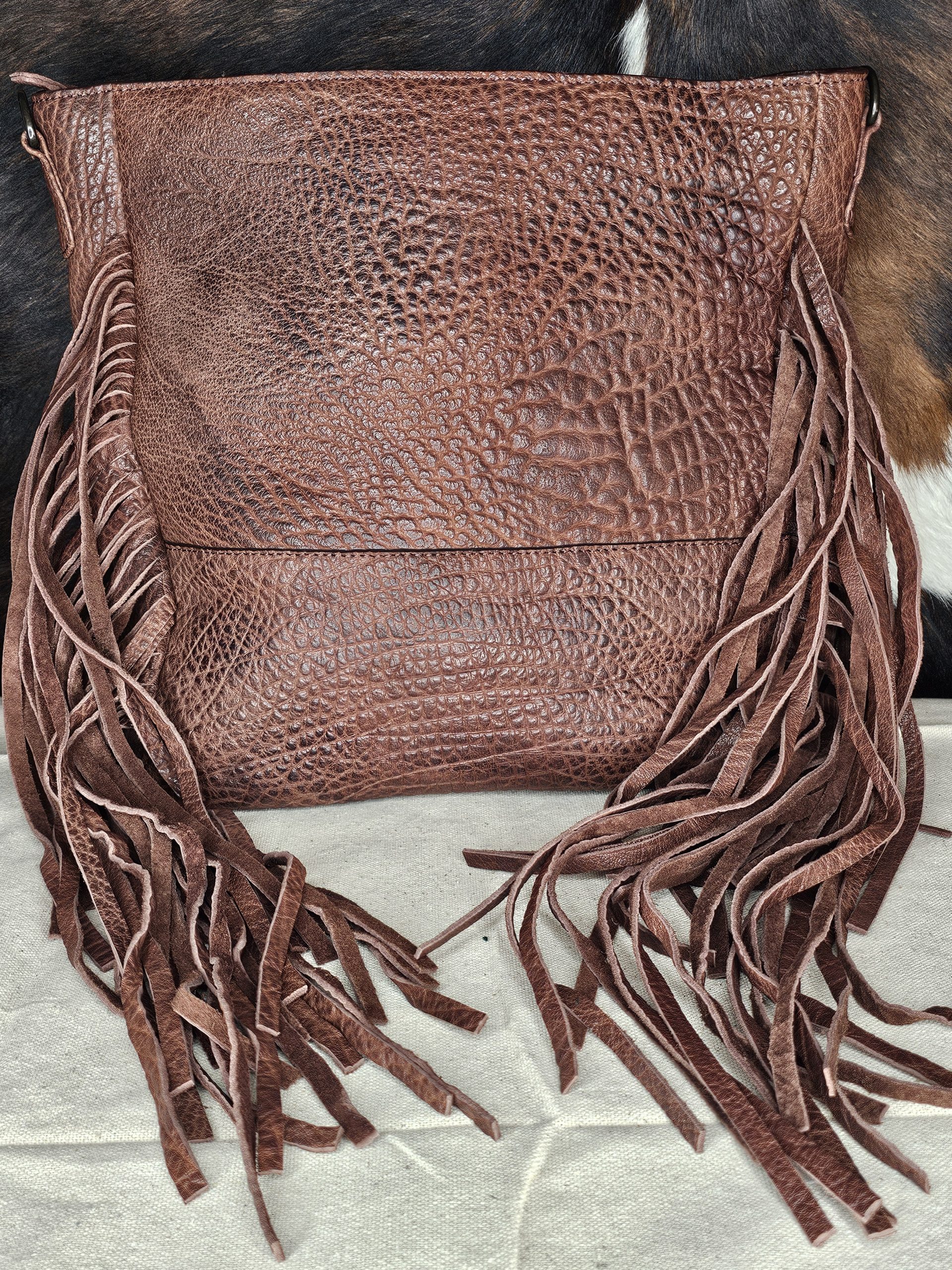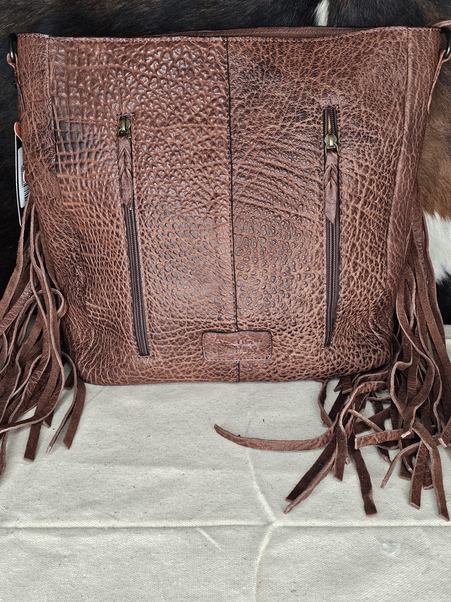 American Darling full grain genuine leather purse. Fringe on both sides. Conceal Carry double zippered pocket on back. Tooled Leather strap. Inside 1 zippered pocket and 2 open pockets. Measures: 16 inches X 4.5 inches X 16 inches.