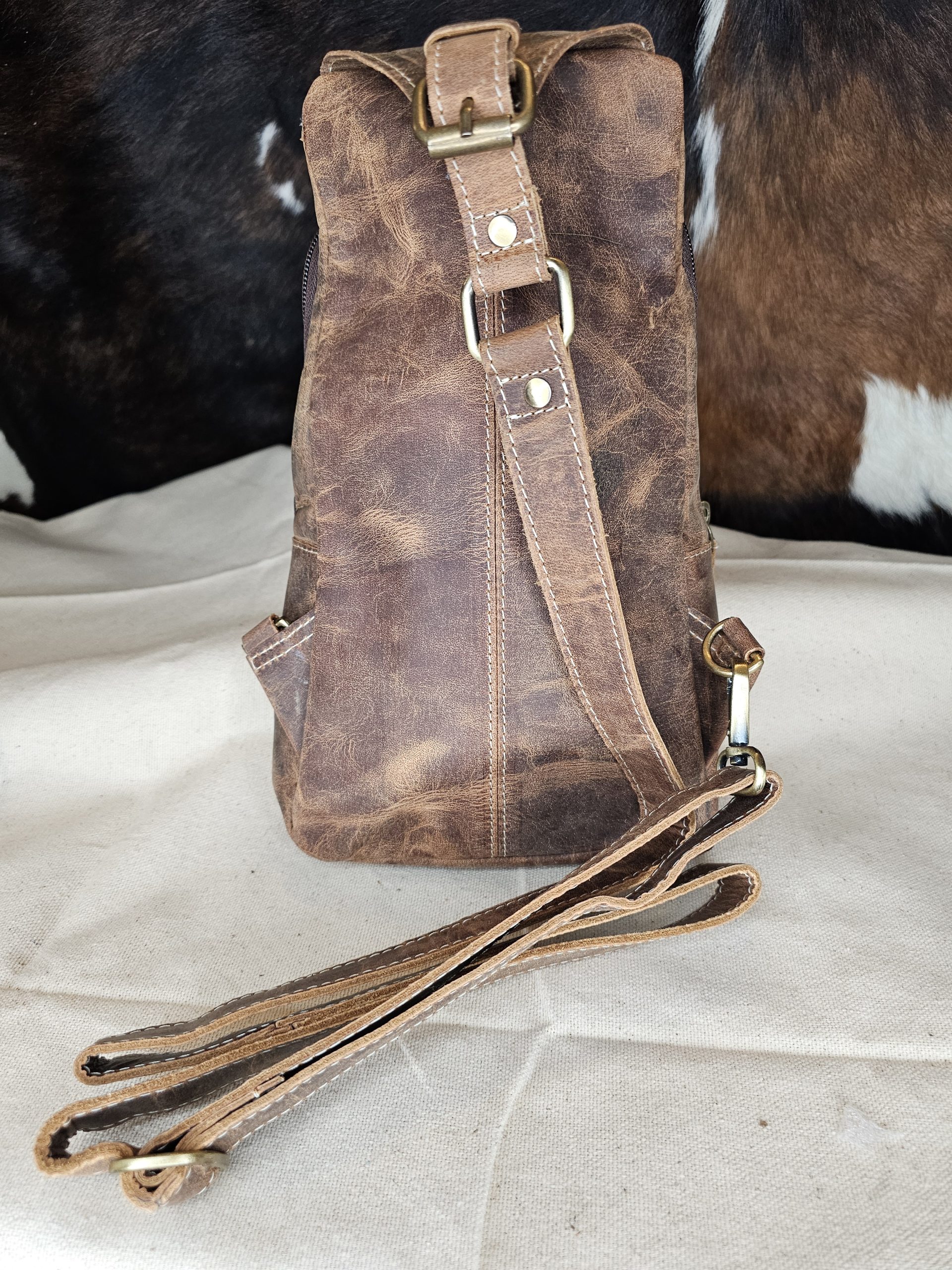 Boho ranch leather and cowhide sling bag. Front has hair on hide with zippered pocket. Inside has 1 zippered pocket and one small open pocket and larger open area. Top zippered closure. Leather adjustable strap. Measures: 7 inches X 3 inches X 10.25 inches.