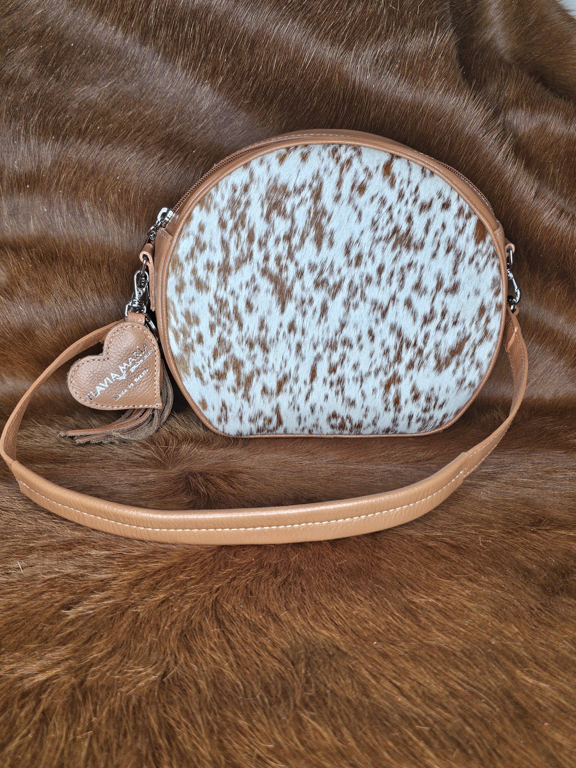 Flavia Maria Genuine cowhide and leather canteen purse/crossbody. Front has brown and white cowhide, back has brown leather. Top zipper. Bottom is leather. One open pocket inside. Has a removable purse strap and a removable/adjustable crossbody strap. Has a removable leather tassel. Measures: 9.5 inches X 2.5 inches X 8 inches.