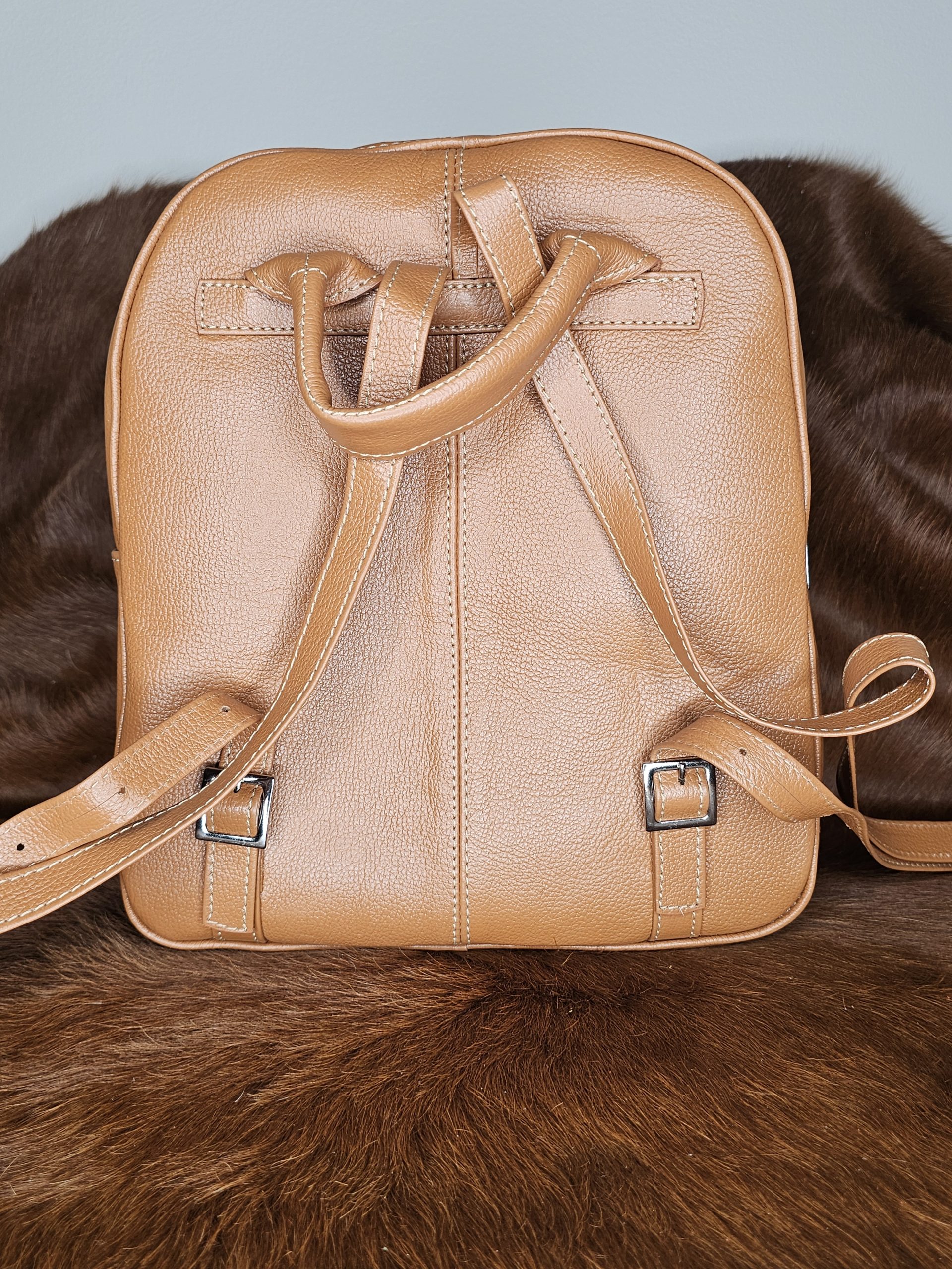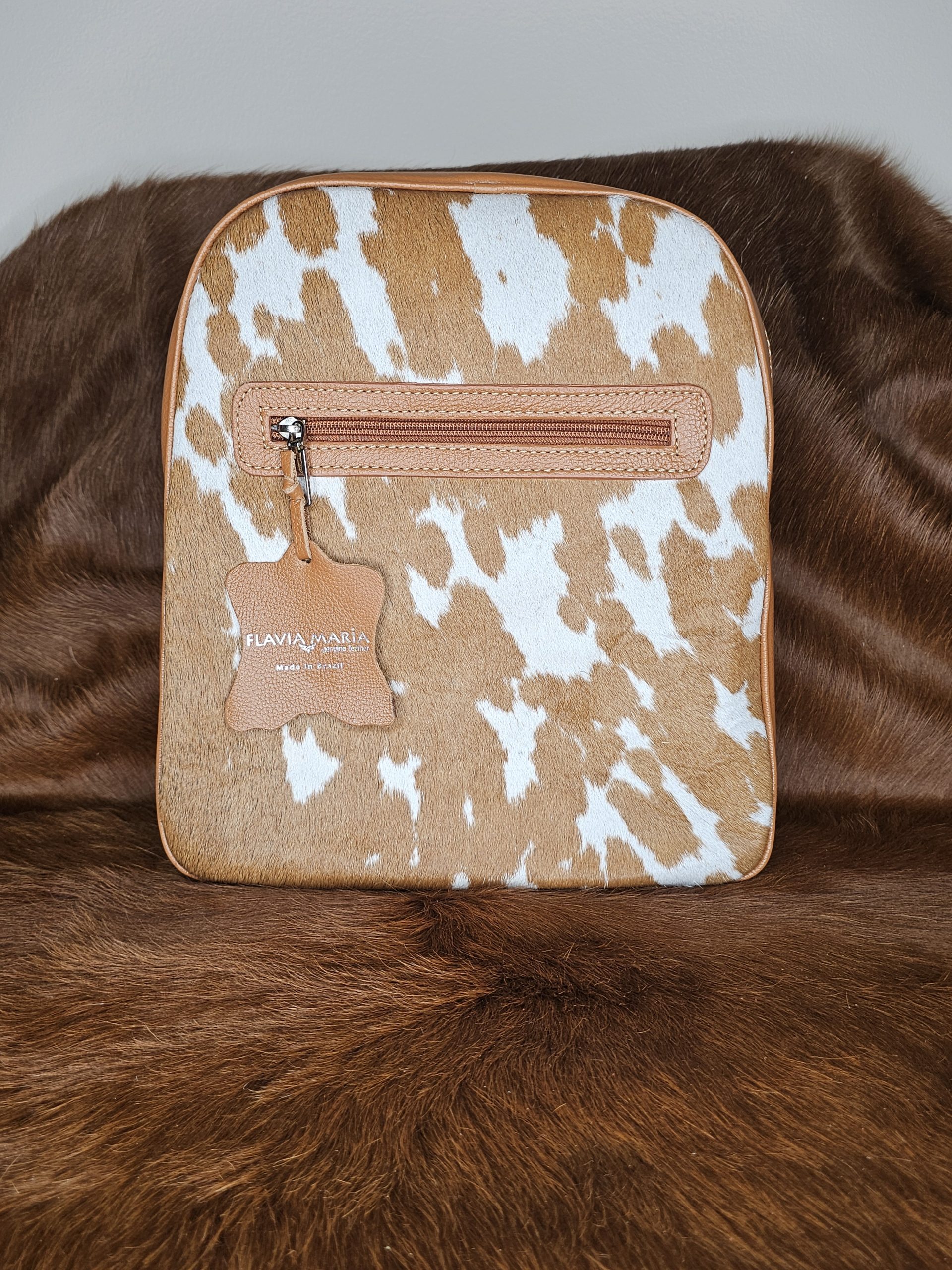 Flavia Maria large backpack. Genuine Tan leather and tan and white cowhide. Front pocket with adjustable straps. Measures 12 inches tall by 11 inches wide.