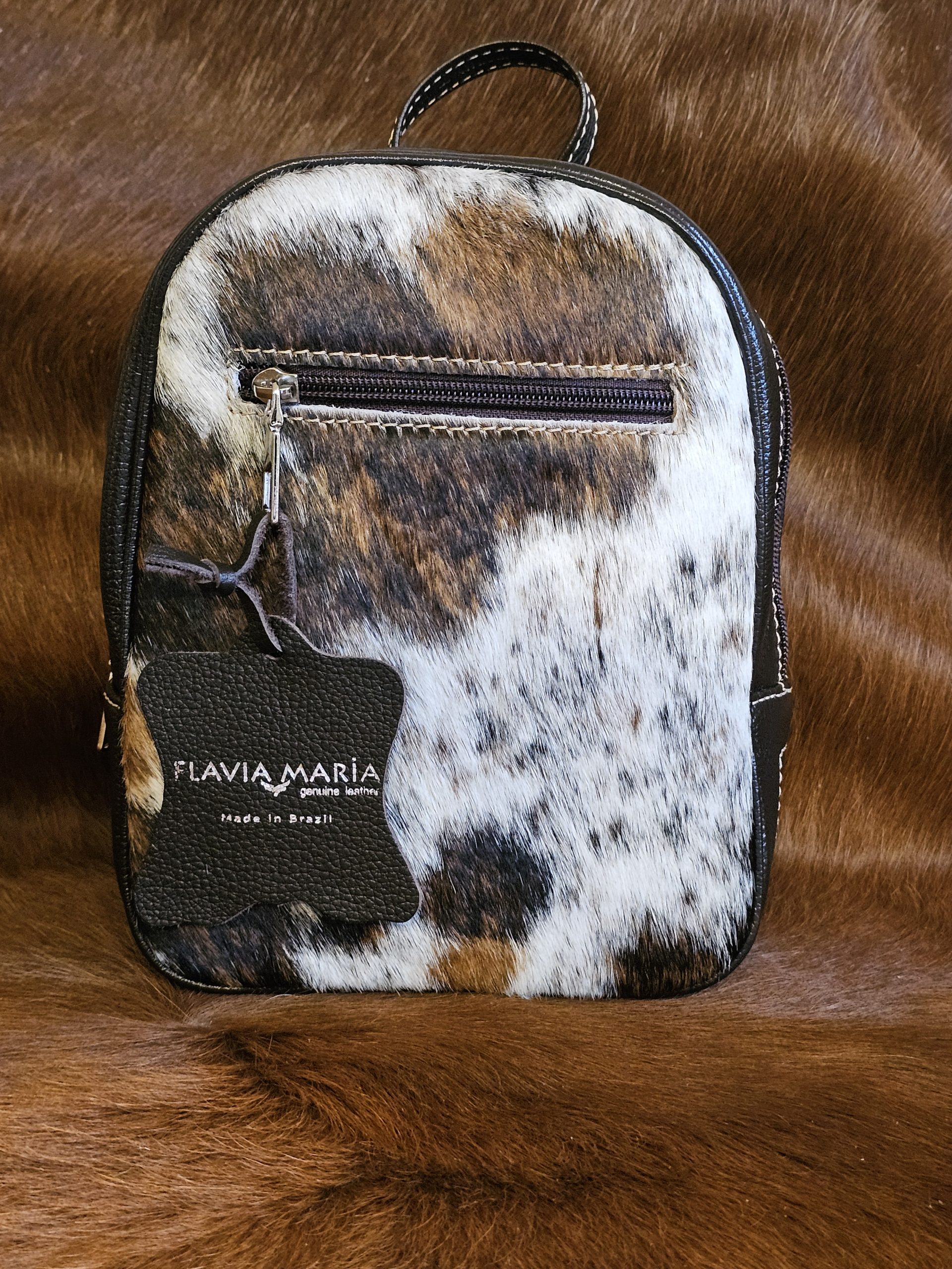 Flavia Maria leather and cowhide small backpack. Dark brown leather. Small front zippered pocket. Long top zipper with small open pouch inside. Inside is lined. Straps are adjustable. Measures: 7.5 inches X 3.5 inches X 9.5 inches.