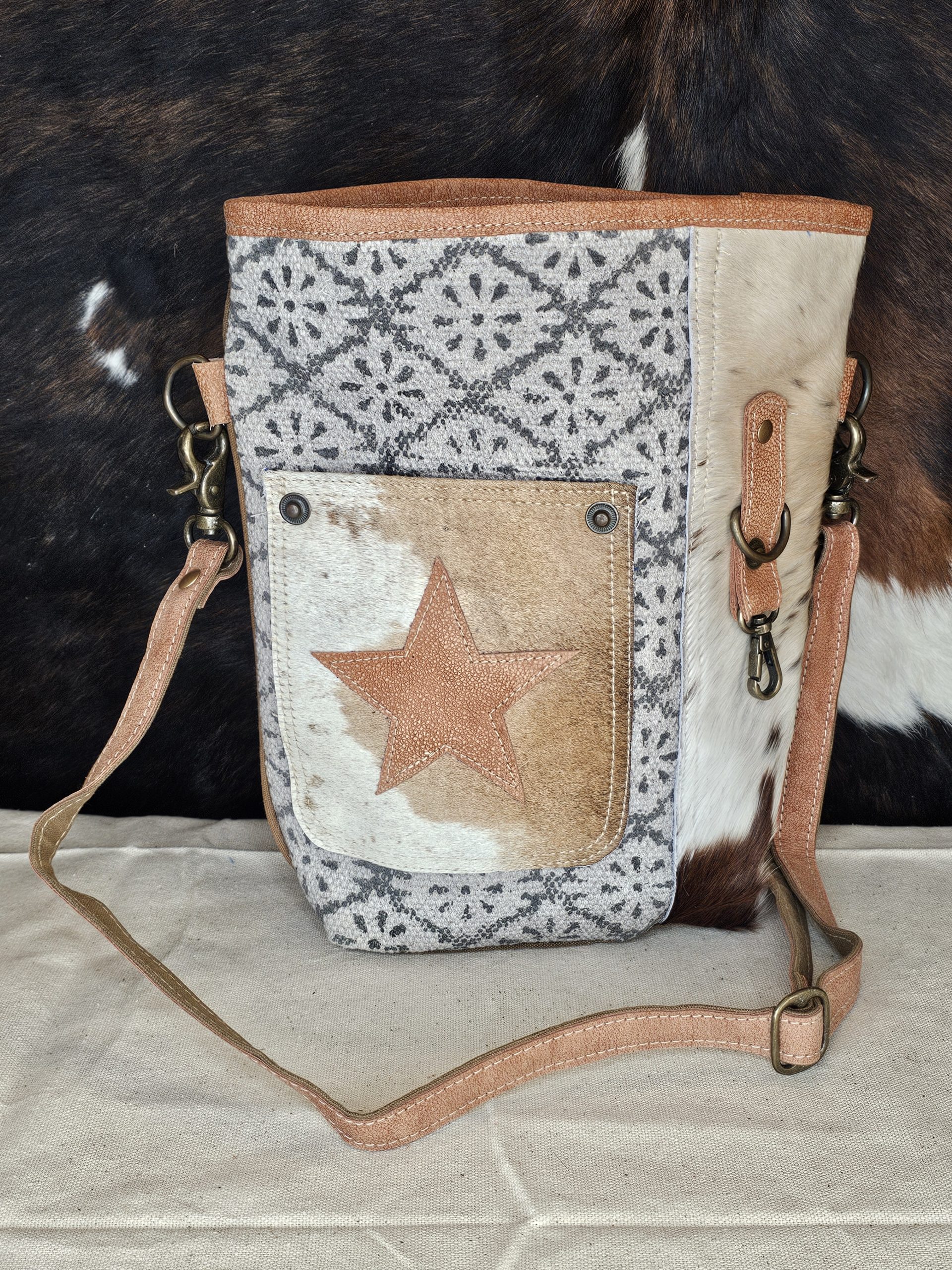 Ohlay Messenger upcycled canvas, hair on genuine leather. Front has open pocket with leather star, clip for keys. Back has zippered pocket. Top zipper closure. Adjustable/detachable leather strap. Inside has zippered pocket and two open pockets. Measures: 12.5 X 3 inches X 13 inches.