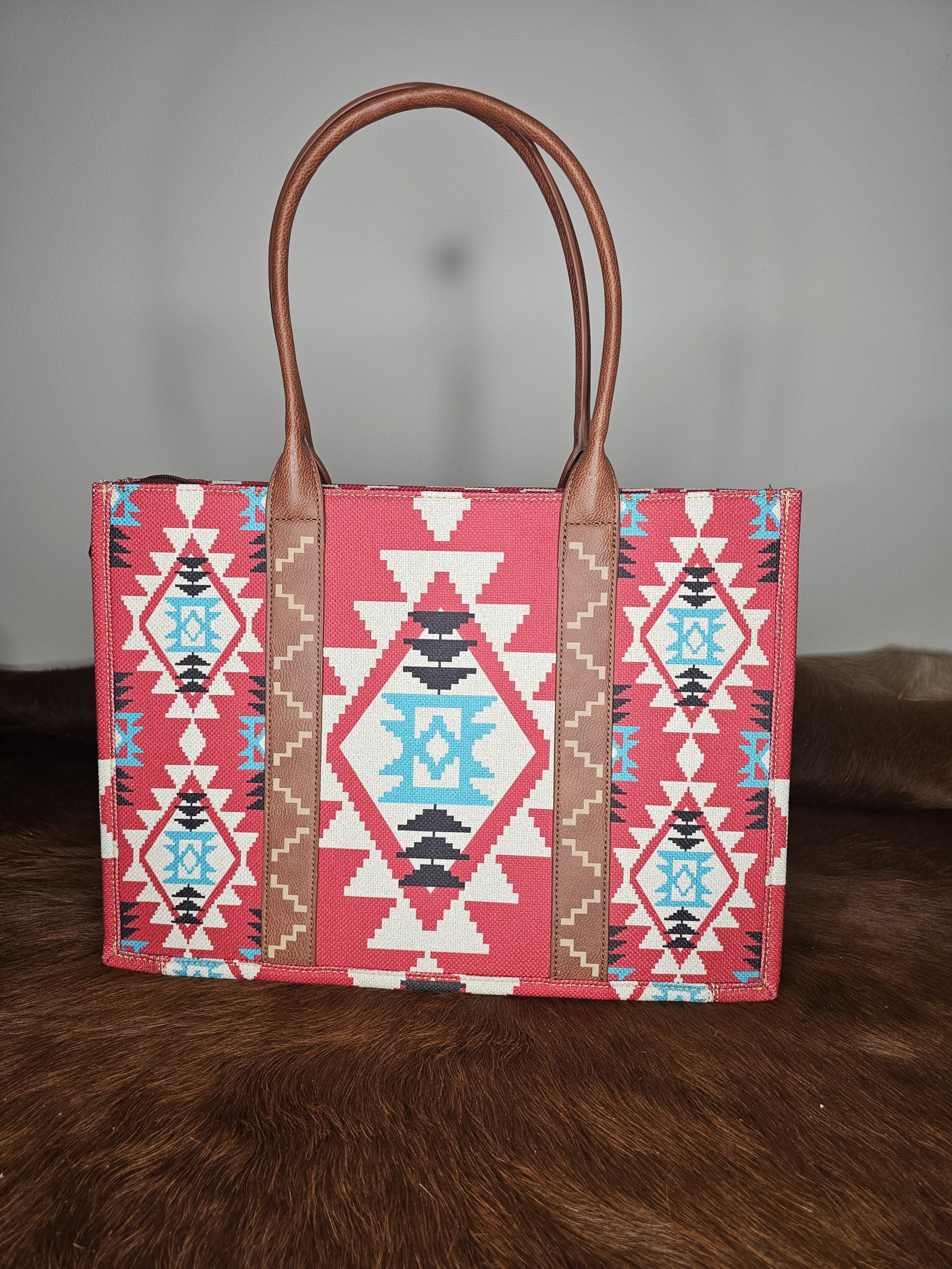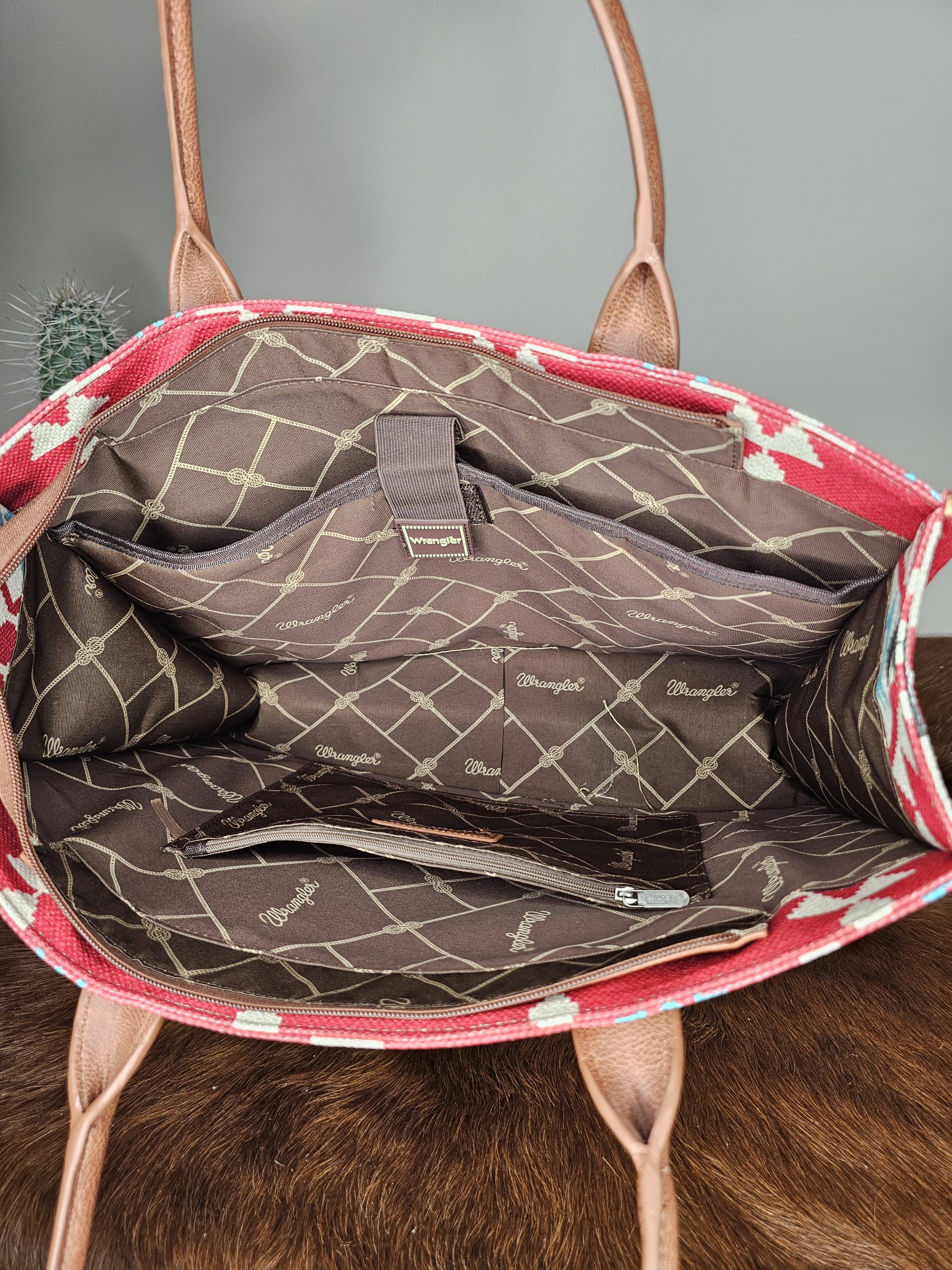 Wrangler Southwestern Print canvas wide tote in burgandy color. Whipstitch details on front. Wrangler logo applique on the front. Top zipper closure. Inside has a zippered pocket and 2 open pockets. Double rounded handle with a 9 inch drop. Measures 17 inches x 5 inches x 13 inches.