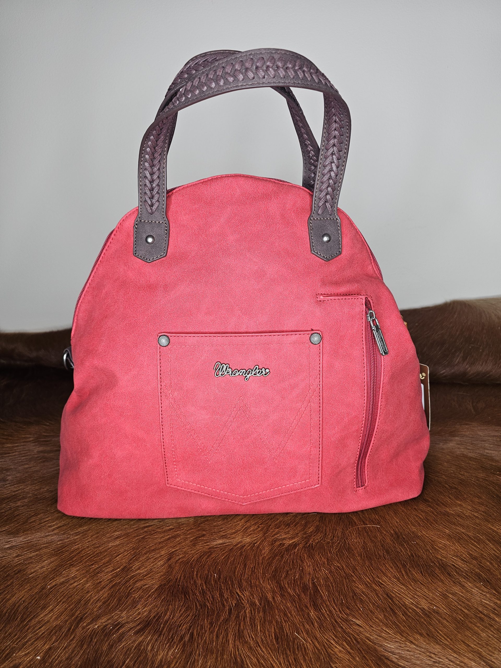Wrangler Red Carry-All Concealed Carry Crossbody Tote. Leather tassels. Wrangler logo embroidered on the front. Top zipper closure. Inside single compartment divided by a medium zippered pocket.