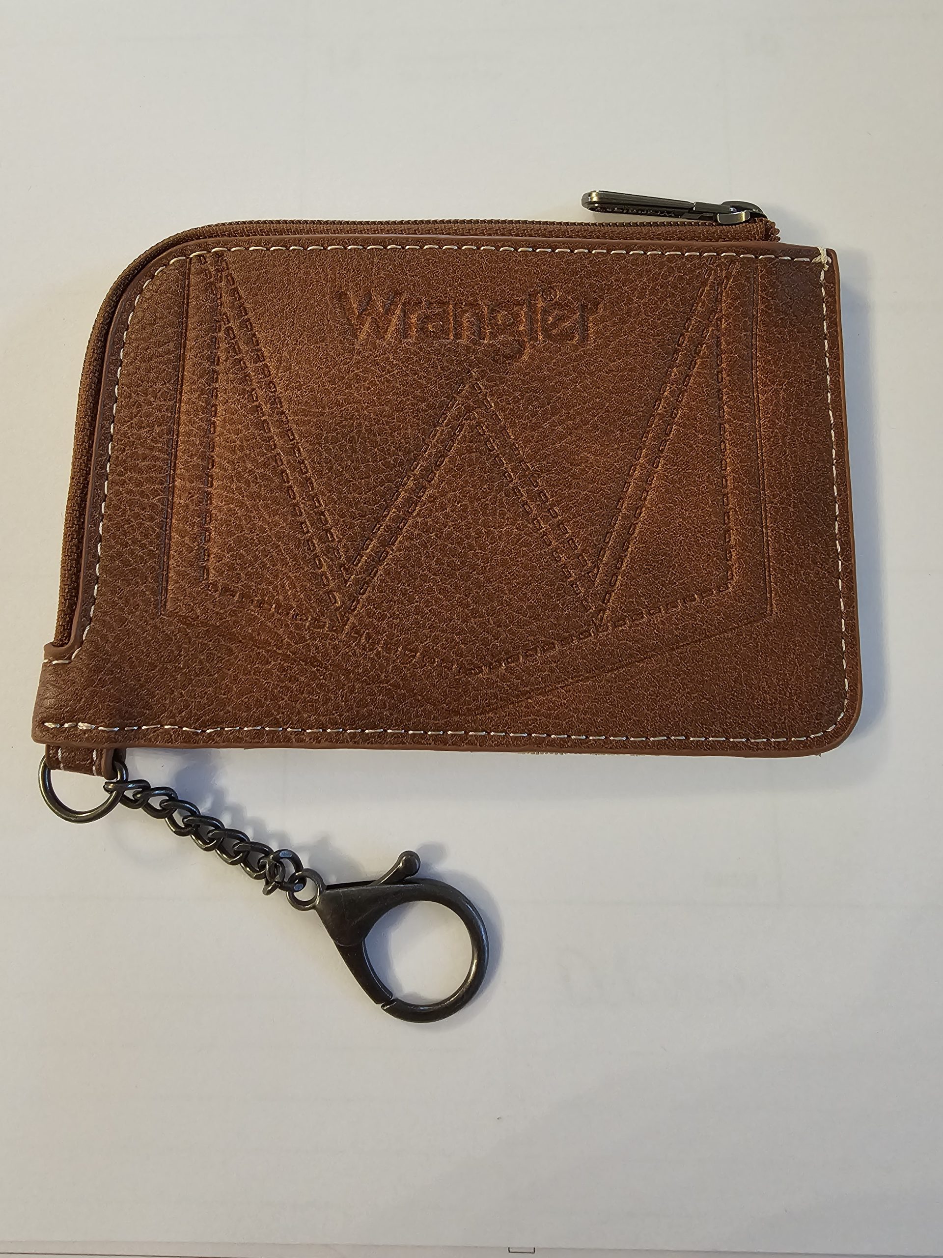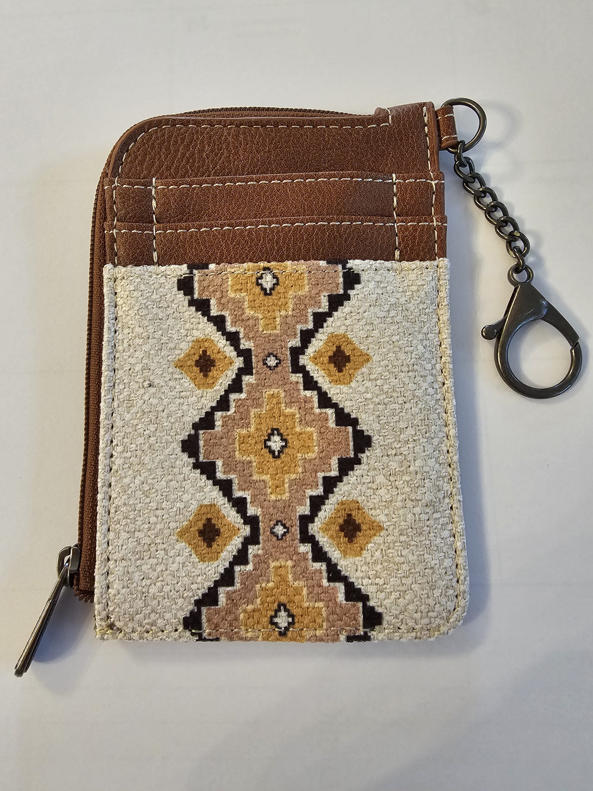 Wrangler Southwestern Art Print Mini Zip Card Case Coffee. This compact case slips easily into pockets. It holds 2 cards and other small essentials. Made of PU leather and canvas, this mini zip card case has: Aztec print on canvas, 2 credit card slot, zip-top closure, fabric lining, Wrangler logo “W” on the back, attached split key ring. Measures 5 inches x 3.5 inches.